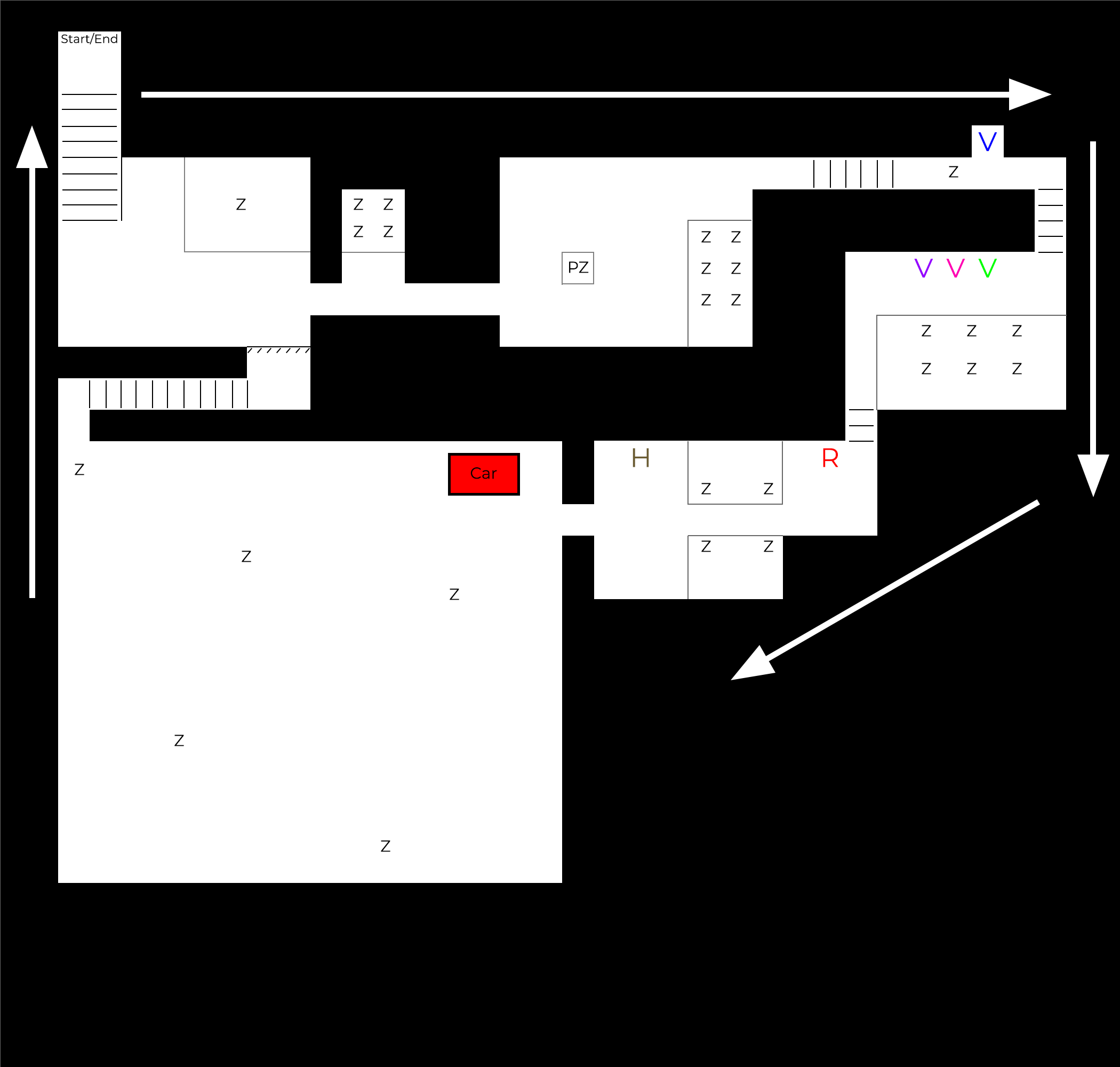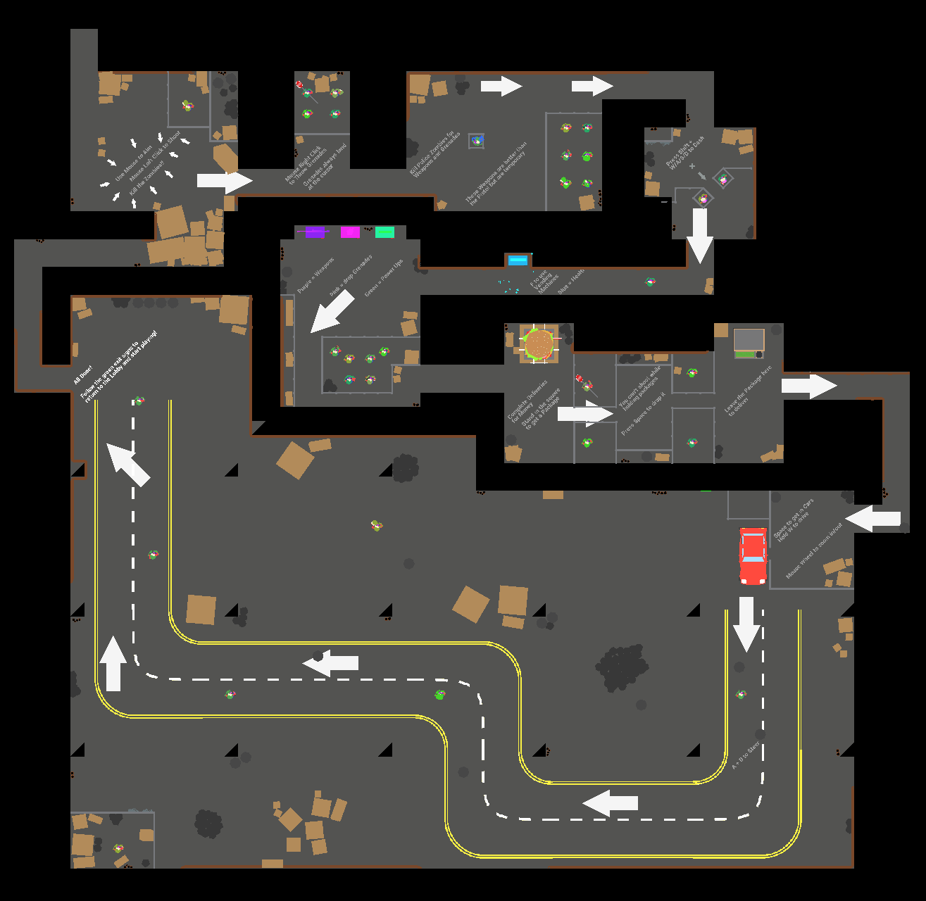 A decision was made to make the short-ranged dash a proper mechanic (rather than just a dev tool) and this had to be reflected in the tutorial. Zombies despawn upon getting too far from the player so each room had to get closer to the player spawn to remedy this. The loop that the level formed had to be cut due to numerous playtesters getting confused by the layout and accidentally repeating the level. Additionally the driving area felt far to claustrophobic and was made much larger to accomodate the car’s high top speed.