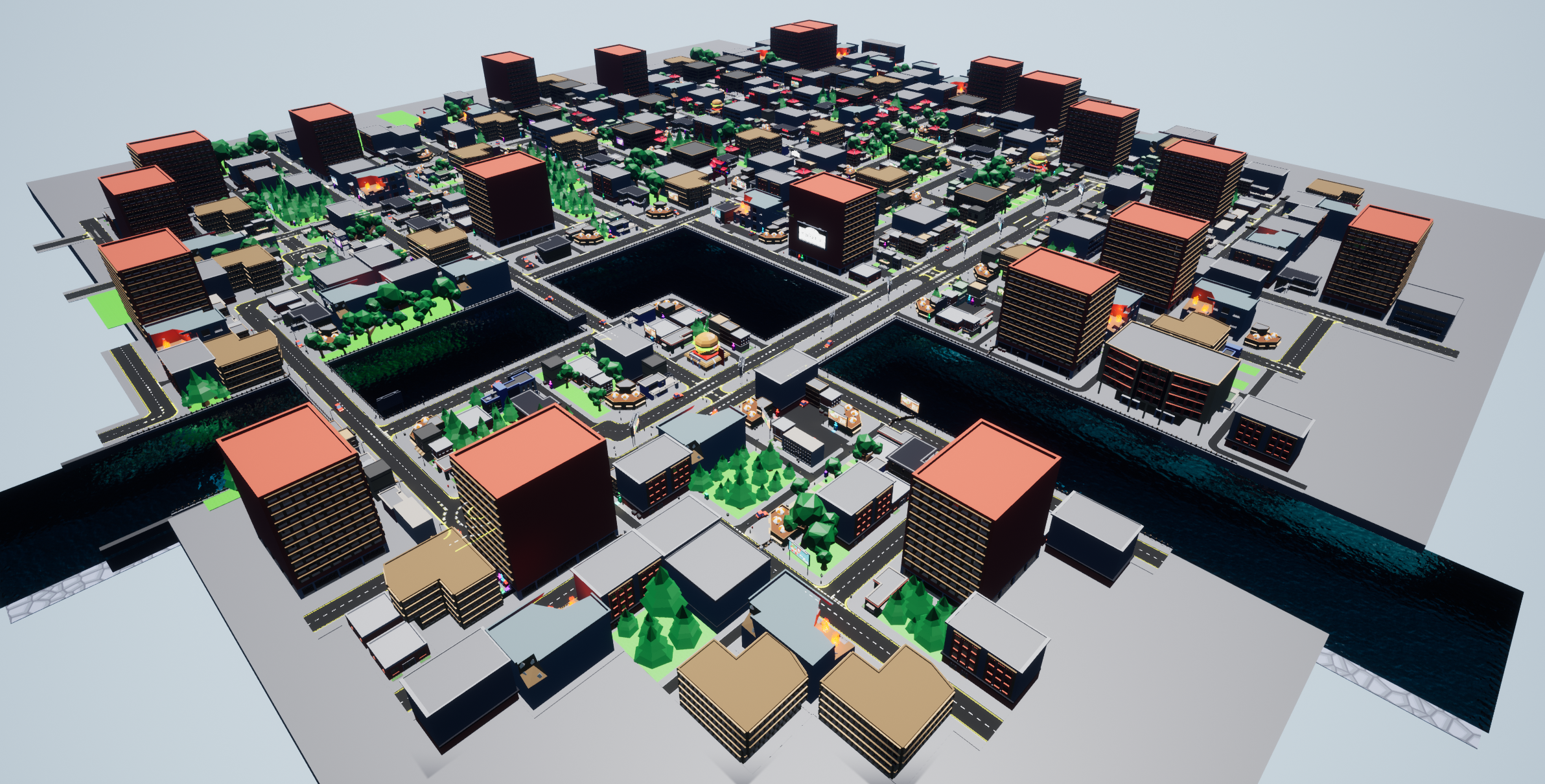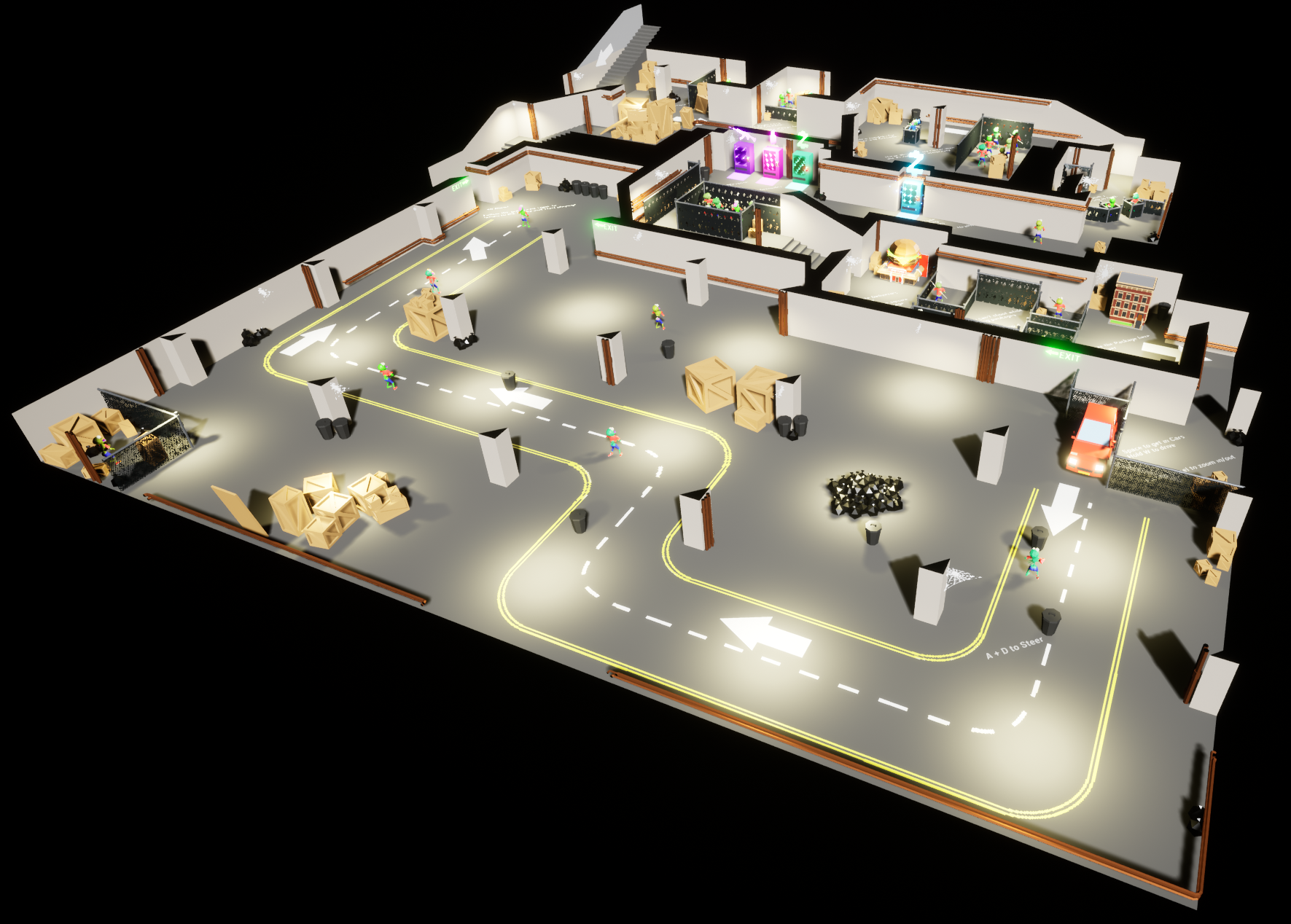The tutorial level was entirely developed (initial planning to final completion) by myself. I had to work within the boundaries of previously created systems and multiple iterations to arrive at the final version. All assets (aside from one shrunken down building) were created and arranged by myself.