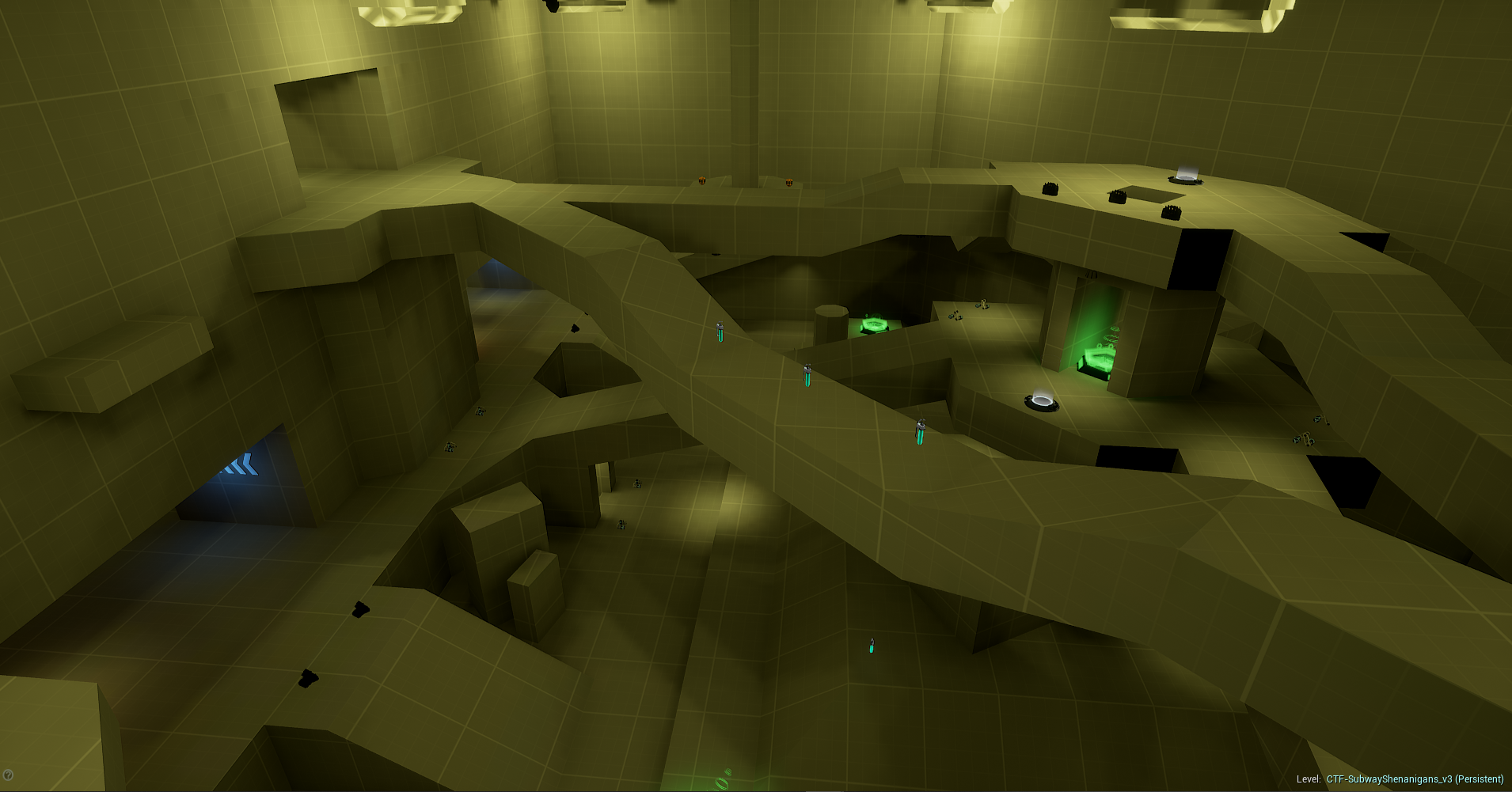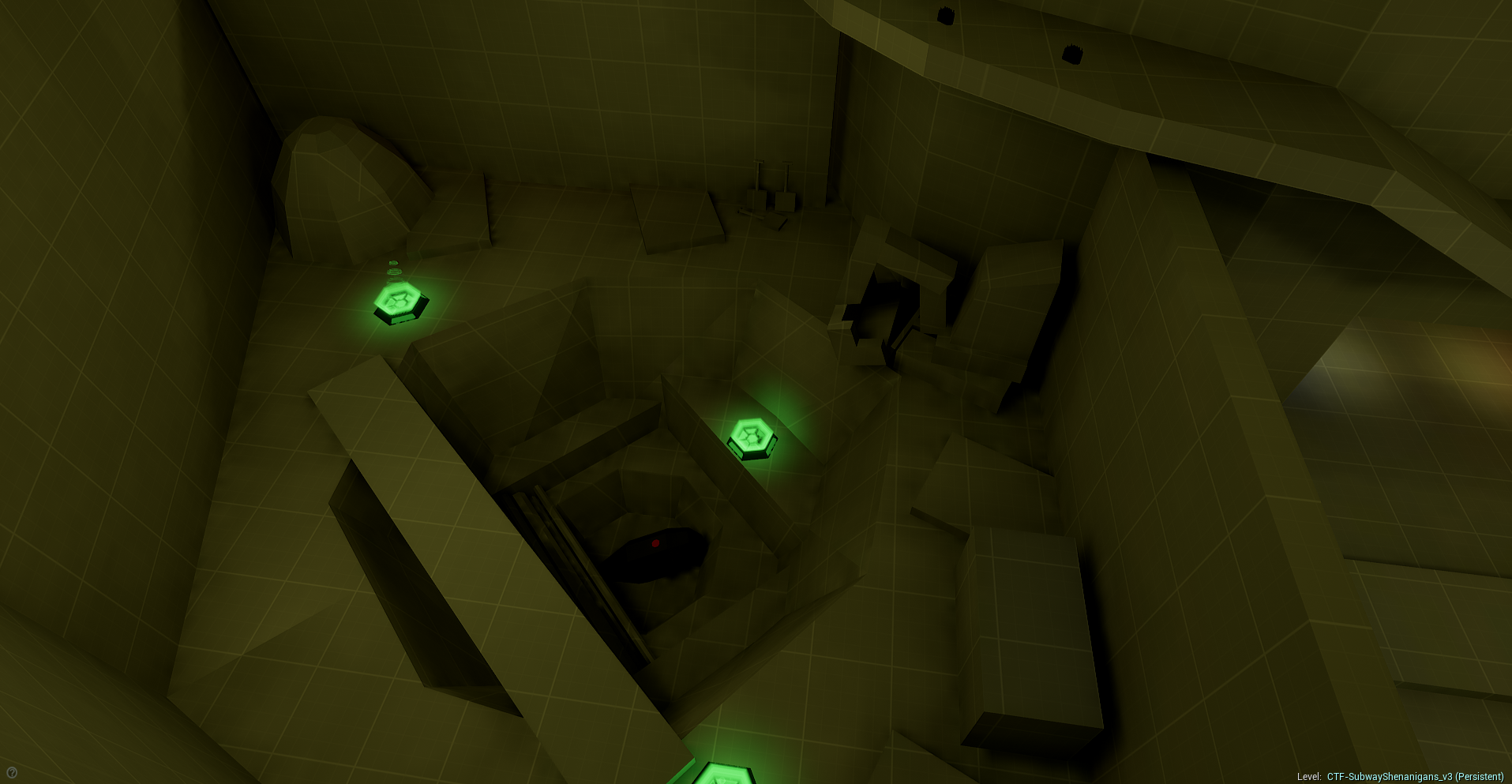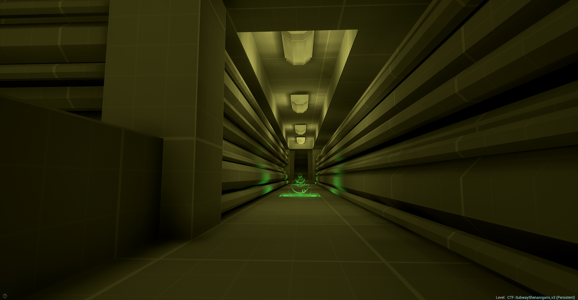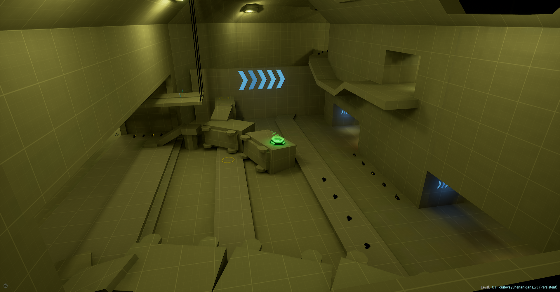 I based the map around the theme of abandoned subway tunnels. This informed the design of map with how I used long underground tunnels with abandoned train cars strewn about which can be for traversal or cover by players. I also represented the theme in the lighting, where I used dim, yellowish lights coming from industrial and sometimes broken fluorescent lights.