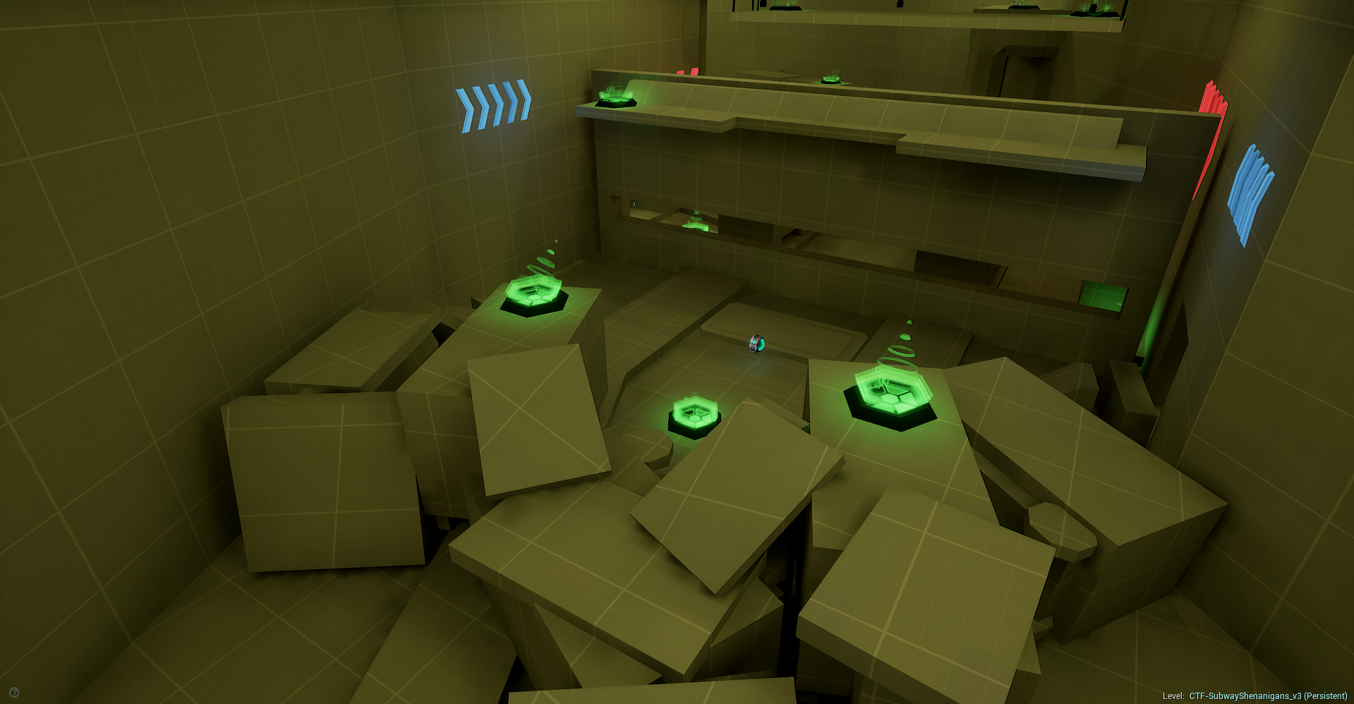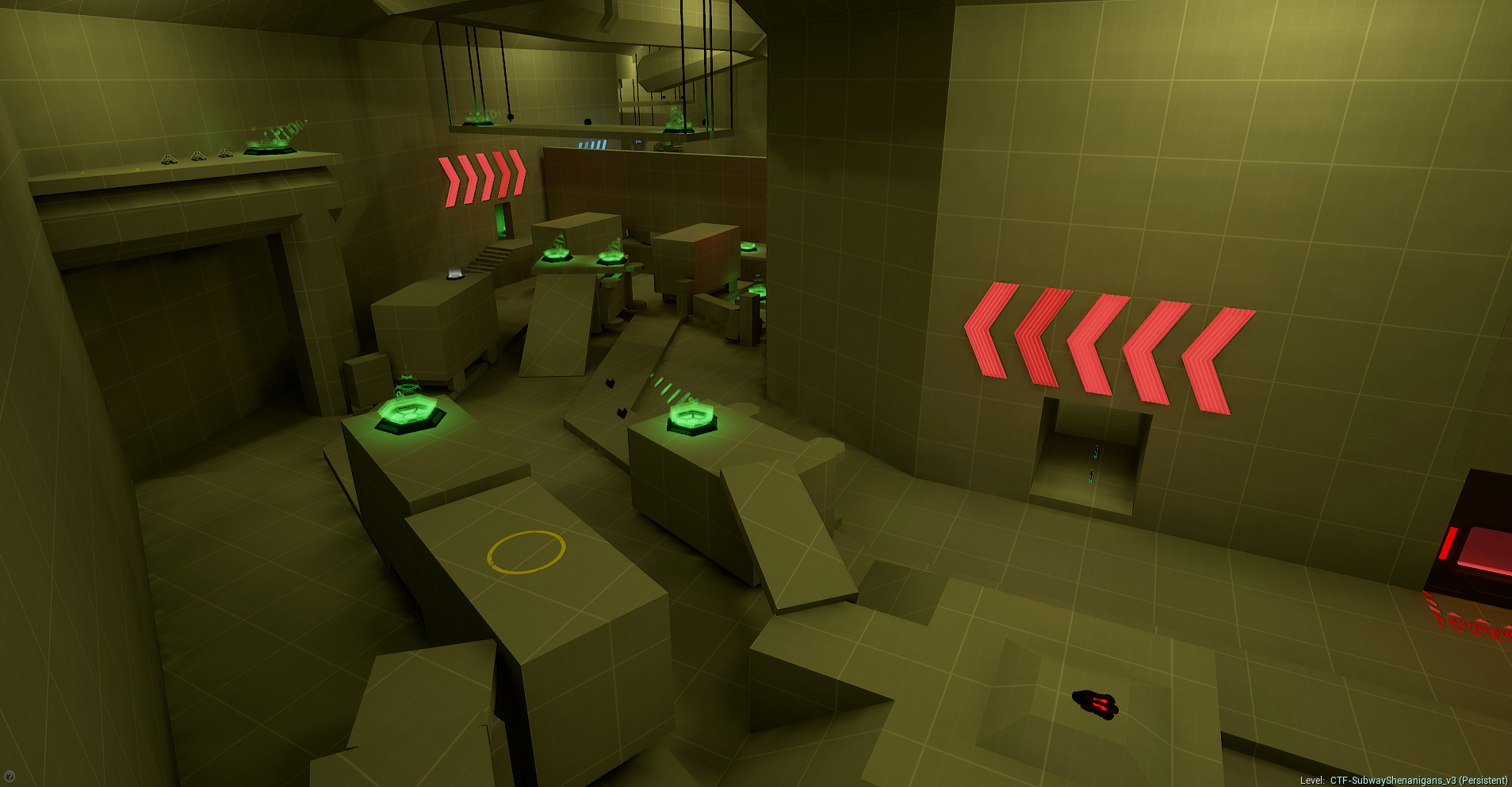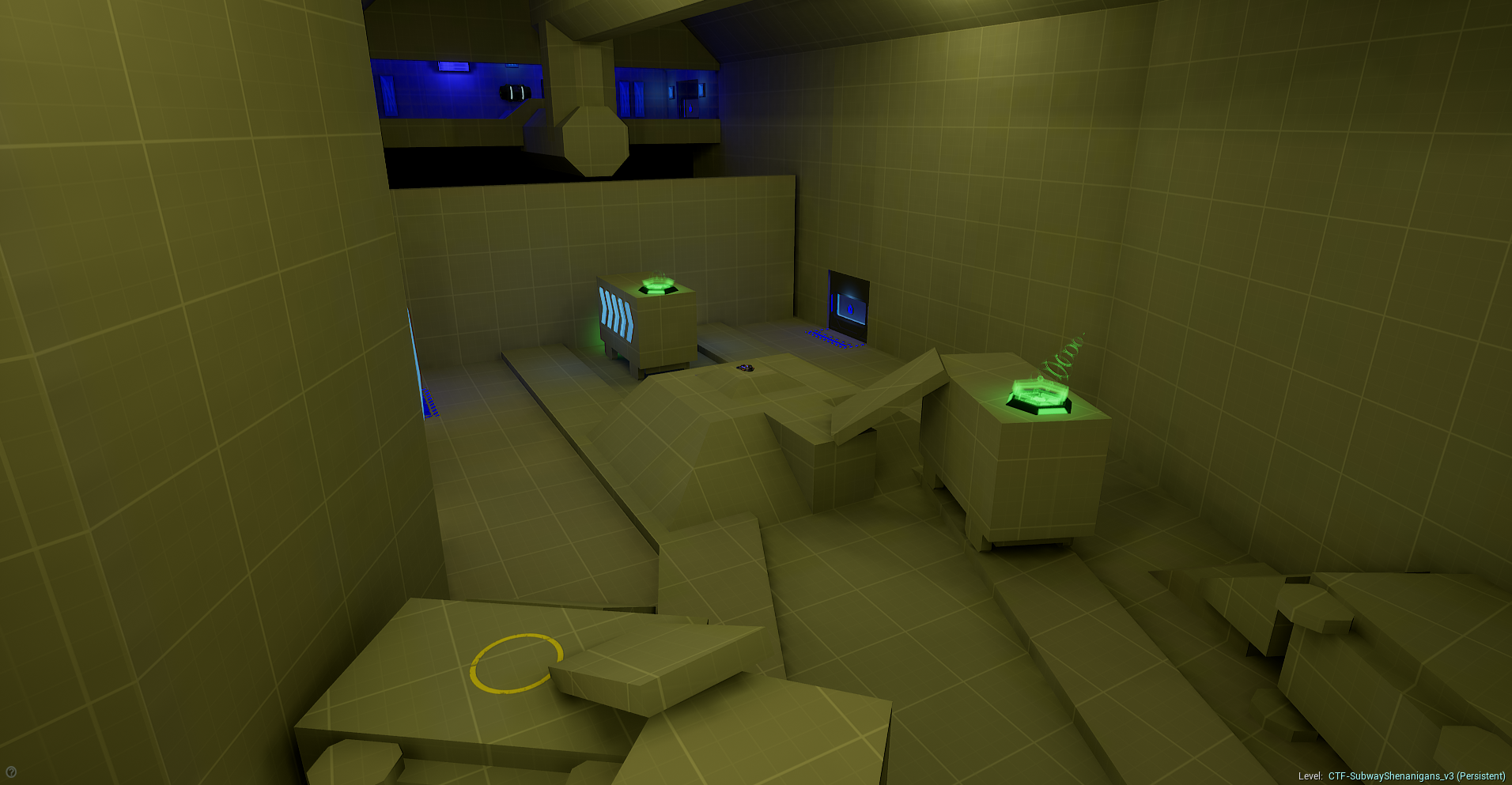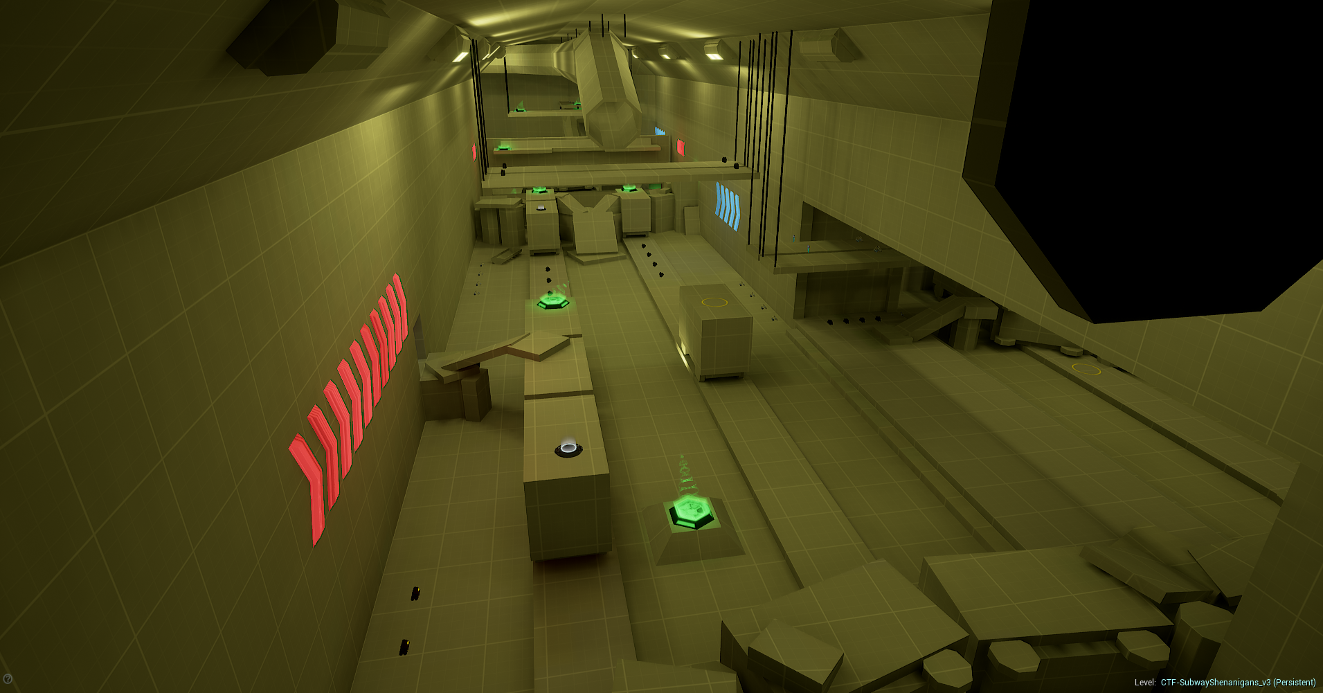 I based the map around the theme of abandoned subway tunnels. This informed the design of map with how I used long underground tunnels with abandoned train cars strewn about which can be for traversal or cover by players. I also represented the theme in the lighting, where I used dim, yellowish lights coming from industrial and sometimes broken fluorescent lights.